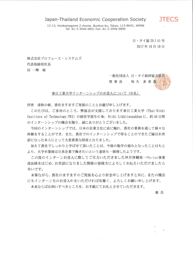受け入れた我々も普段気付かないことへの気付きがあり、有意義なものとなりました。また、一般社団法人日・タイ経済協力協会からお礼をいただきました。