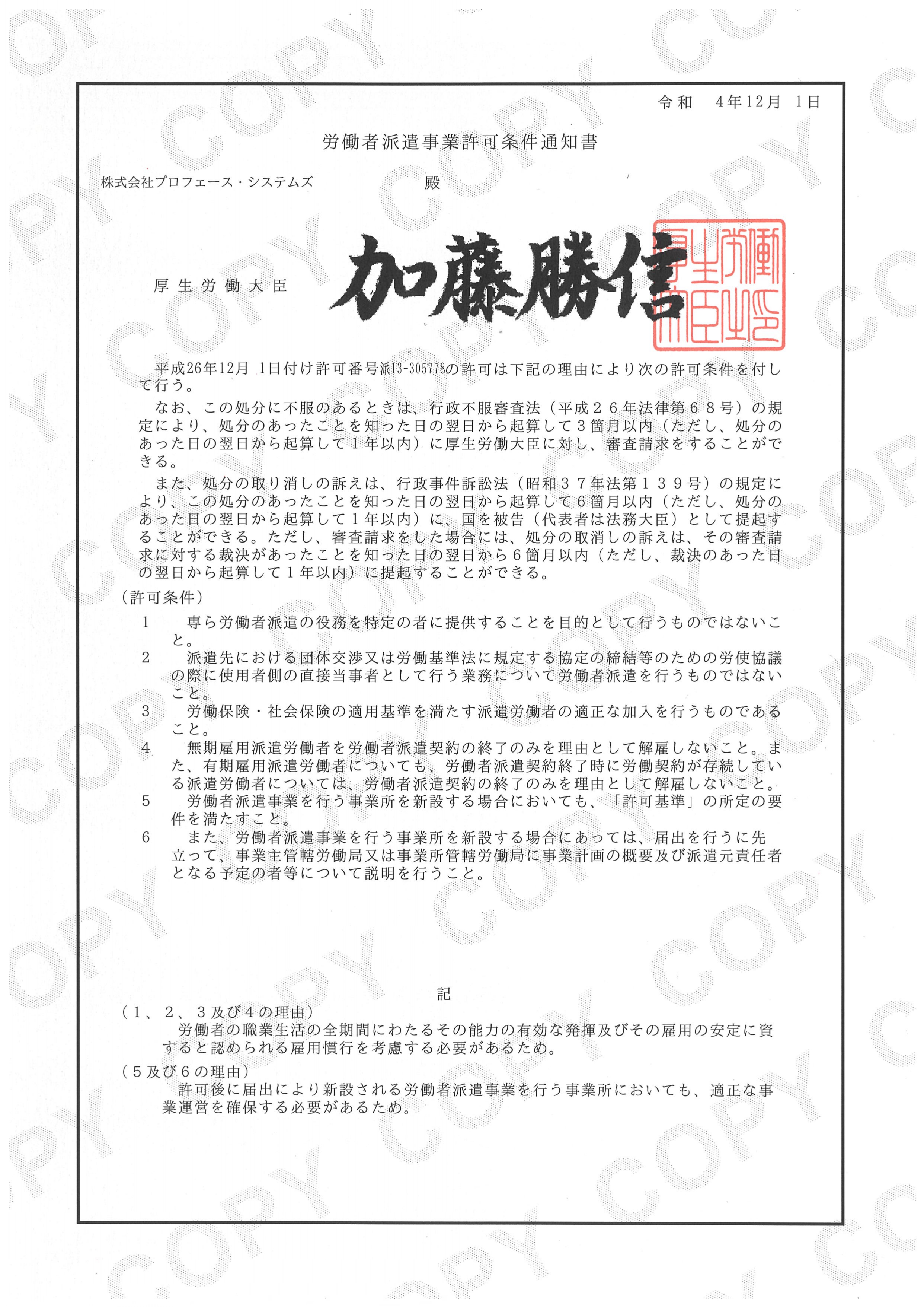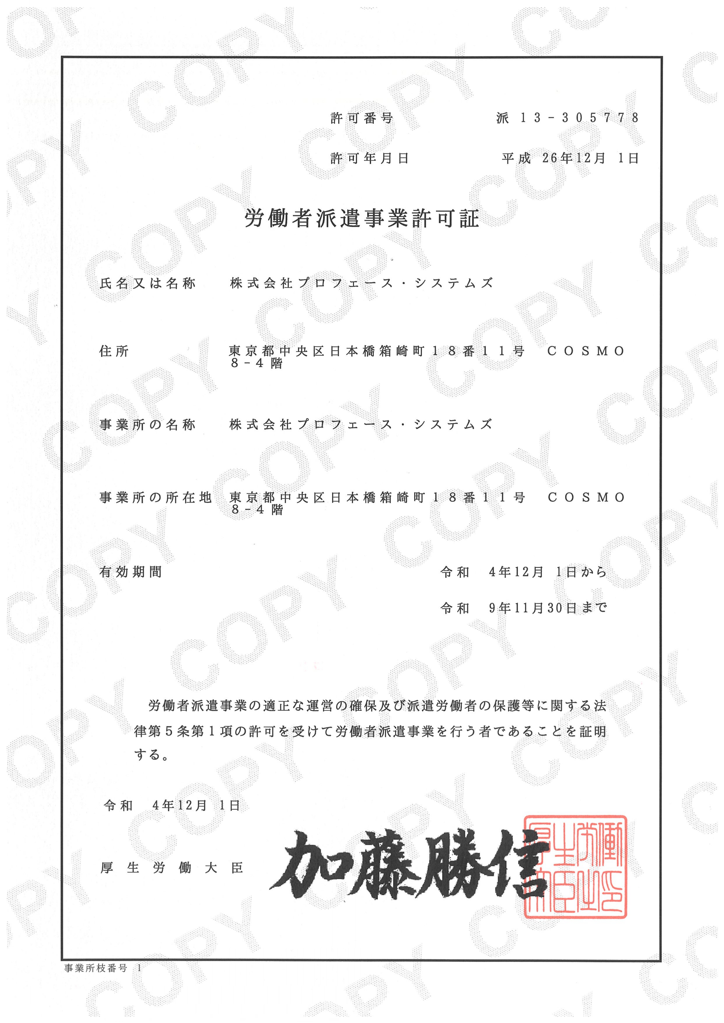 厚生労働省労働者派遣事業許可証【許可番号:派13-305778】を平成26年12月1日付で取得しました。